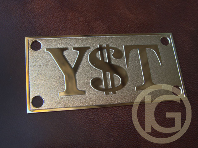 Шильдики з металу "Y$T", на дизайнерські сумки і клатчі, виготовлені на замовлення для бренду Yarose Shulzhenko, метод виробництва шильдів - травлення металу.